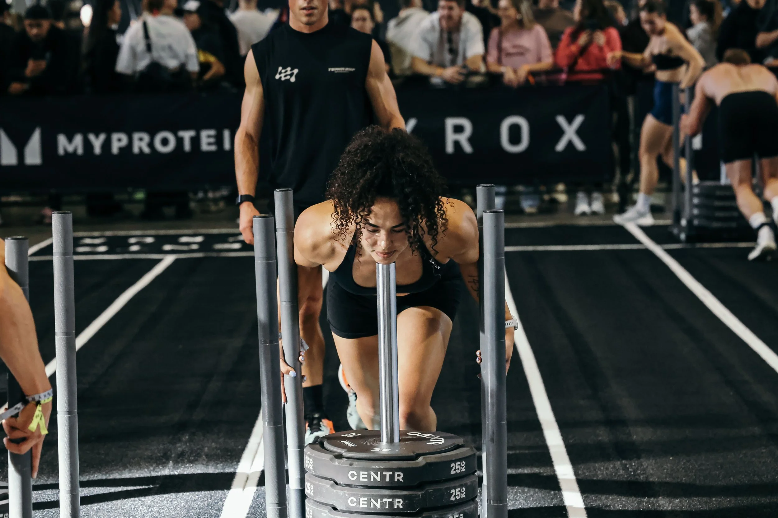 A woman with curly hair, dressed in black athletic wear, is leaning forward with her hands on her knees, against a concrete wall, appearing to catch her breath after exercising.